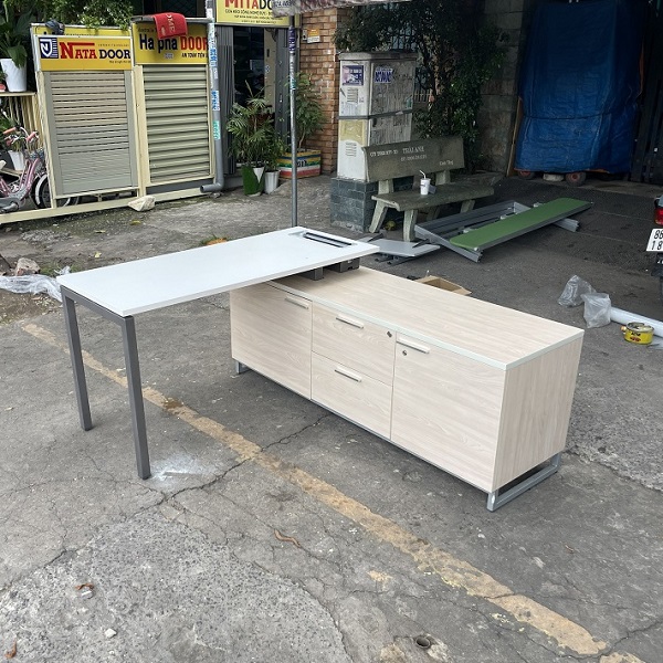 Tình trạng: Bàn làm việc giám đốc chữ thanh lý này là sản phẩm đã qua sử dụng được chúng tôi thu mua về tân trang và vệ sinh sạch sẽ, bàn có chất liệu cao cấp, kiểu dáng sang trọng, mua về sử dụng lâu dài mà không lo hư hỏng hay dễ thấm nước. Bàn giám đốc thanh lý này có hộc tủ rất cứng cáp tạo cảm giác thoải mái và rộng rãi khi sử dụng, đặc biệt Kho Thanh Lý HD luôn có nhiều sản phẩm có nhiều màu sắc, kích thước và số lượng bàn ghế văn phòng thanh lý phù hợp cho quý khách hàng đang muốn setup bàn ghế cũ tại TPHCM giá rẻ.