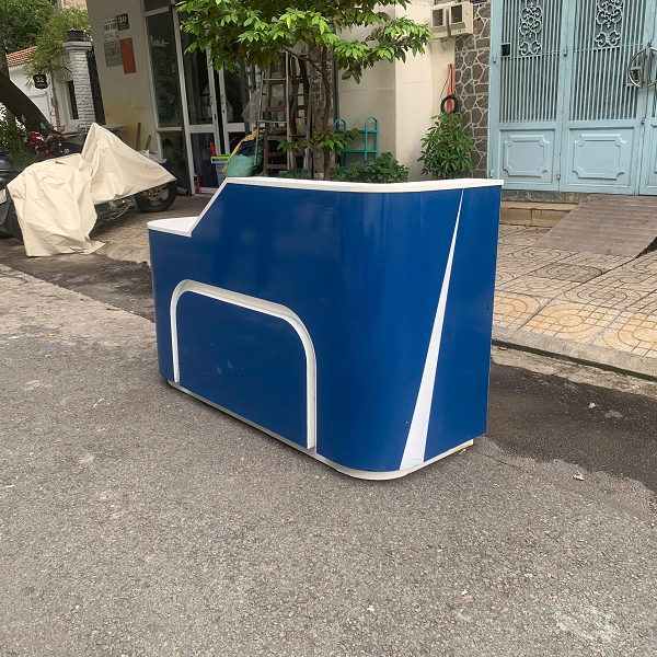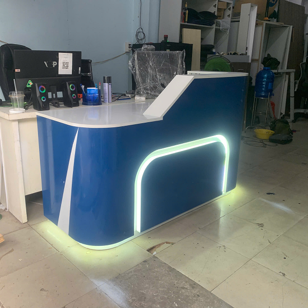 Quầy lễ tân có đèn 1m6 được thiết kế hiện đại, kết hợp hài hòa hai gam màu xanh – trắng cùng hệ thống đèn LED tạo điểm nhấn sang trọng và nổi bật. Chất liệu gỗ MDF bền chắc, bề mặt sơn phủ sáng bóng, dễ lau chùi và giữ được vẻ đẹp lâu dài. Kích thước 1m60 x 60cm x 1m vừa gọn gàng vừa đáp ứng tốt nhu cầu sử dụng trong nhiều không gian khác nhau như văn phòng, showroom, cửa hàng, spa hoặc quán dịch vụ. Sản phẩm là hàng thanh lý còn mới lên đến 90%, đảm bảo tính thẩm mỹ và tiết kiệm chi phí đầu tư.